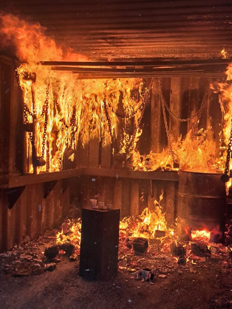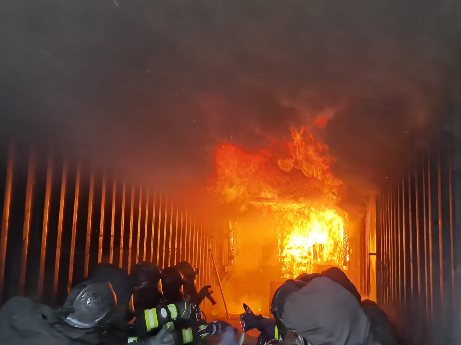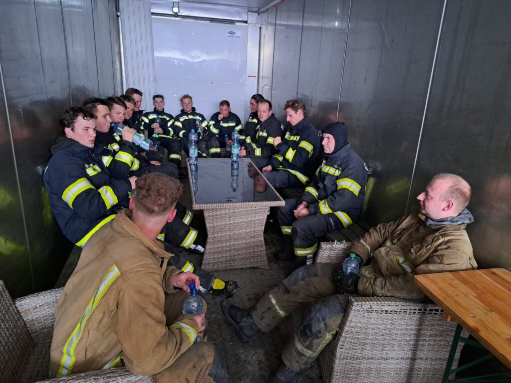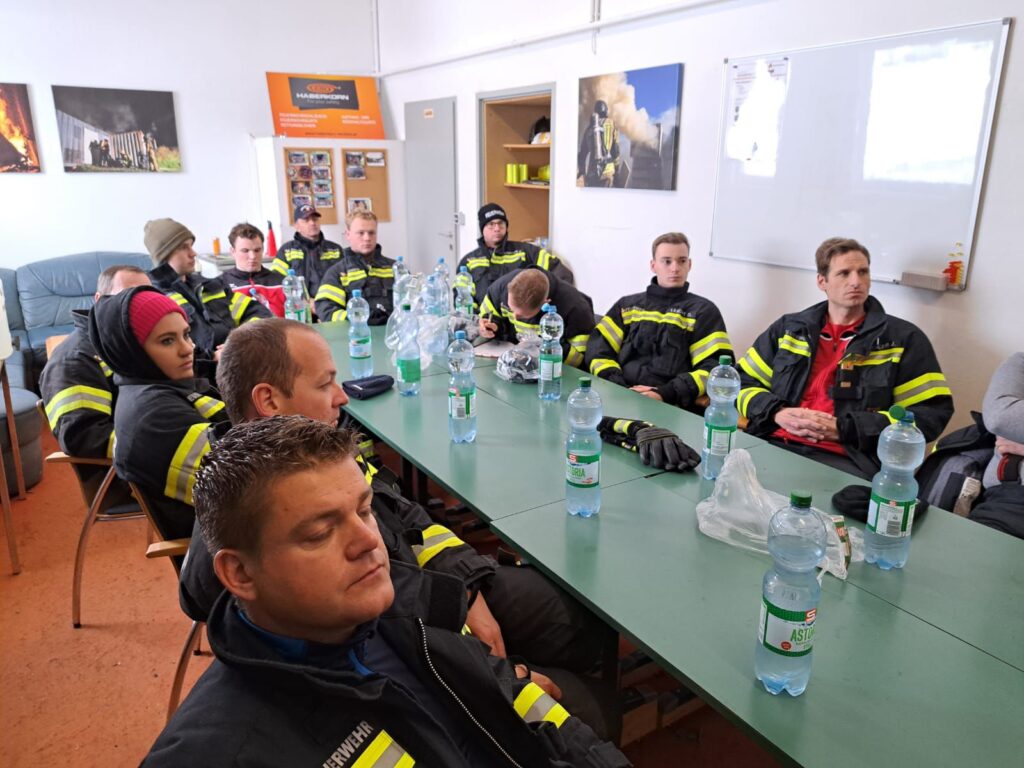 Nach einem kurzen Theorieteil ging es in den Brandcontainer, wo die Ausbilder die verschiedenen Brandphasen zeigten. Dabei konnte gut beobachtet werden, wie sich ein Feuer entwickelt und wie sich die Hitze im Container verändert. Besonders eindrucksvoll war das Gefühl, den entstehenden Wasserdampf bei der Brandbekämpfung hautnah zu erleben.