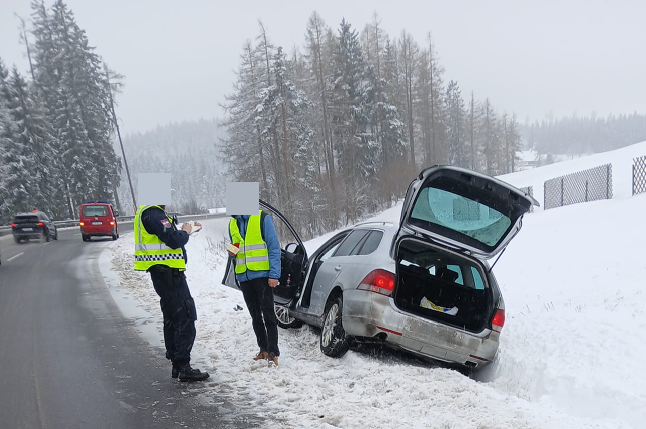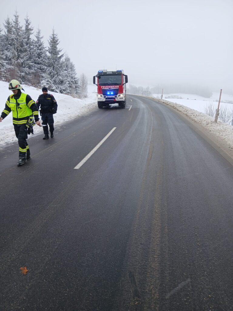 Aufgrund der rutschigen Fahrbahn kam ein Pkw von der Bundesstraße ab und landete im Straßengraben. Mittels Seilwinde wurde das Fahrzeug wieder sicher auf die Fahrbahn zurückgezogen.