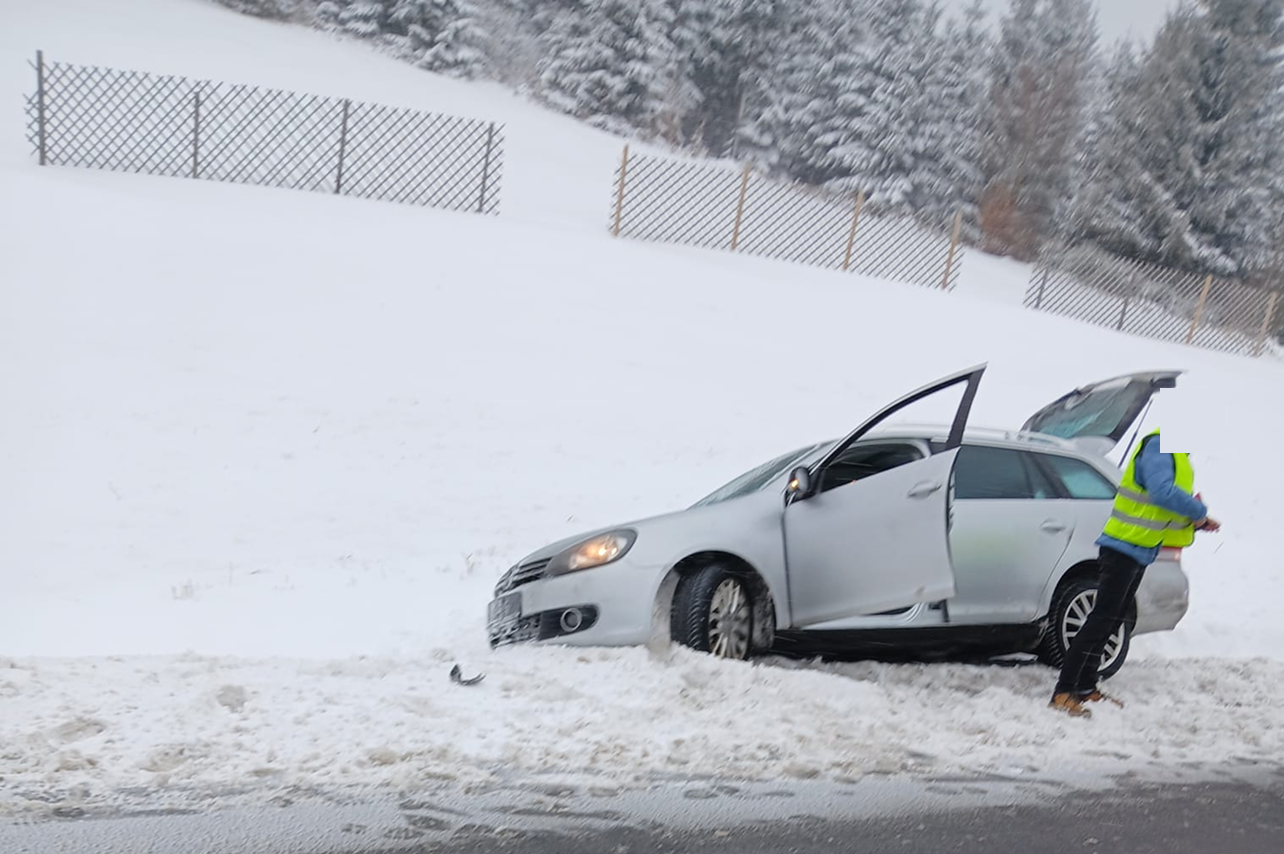 Aufgrund der rutschigen Fahrbahn kam ein Pkw von der Bundesstraße ab und landete im Straßengraben. Mittels Seilwinde wurde das Fahrzeug wieder sicher auf die Fahrbahn zurückgezogen.
