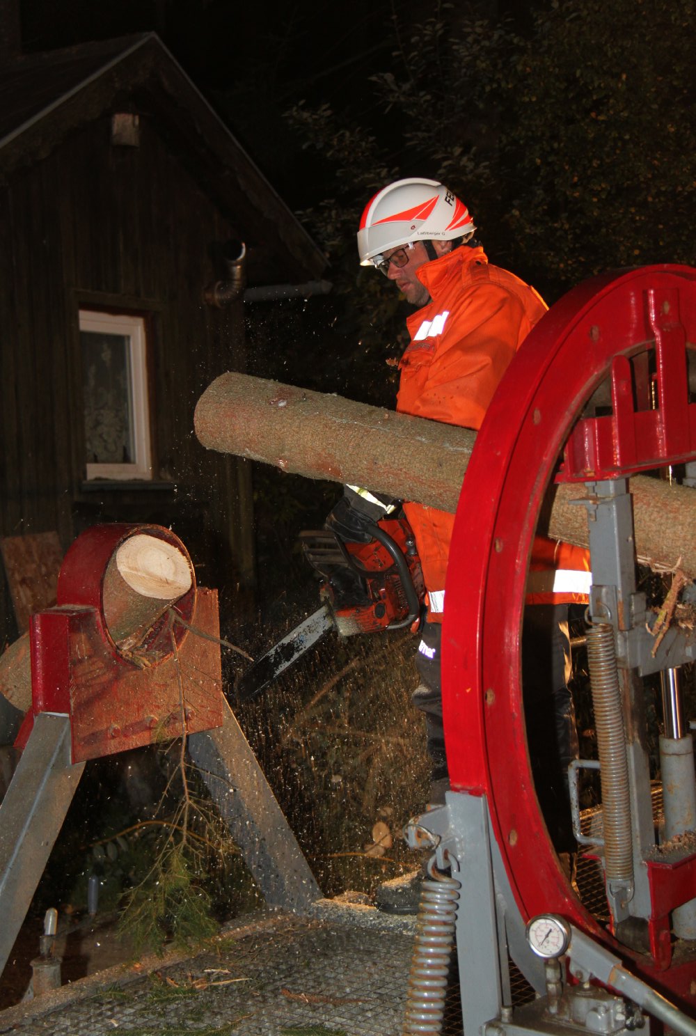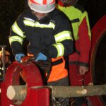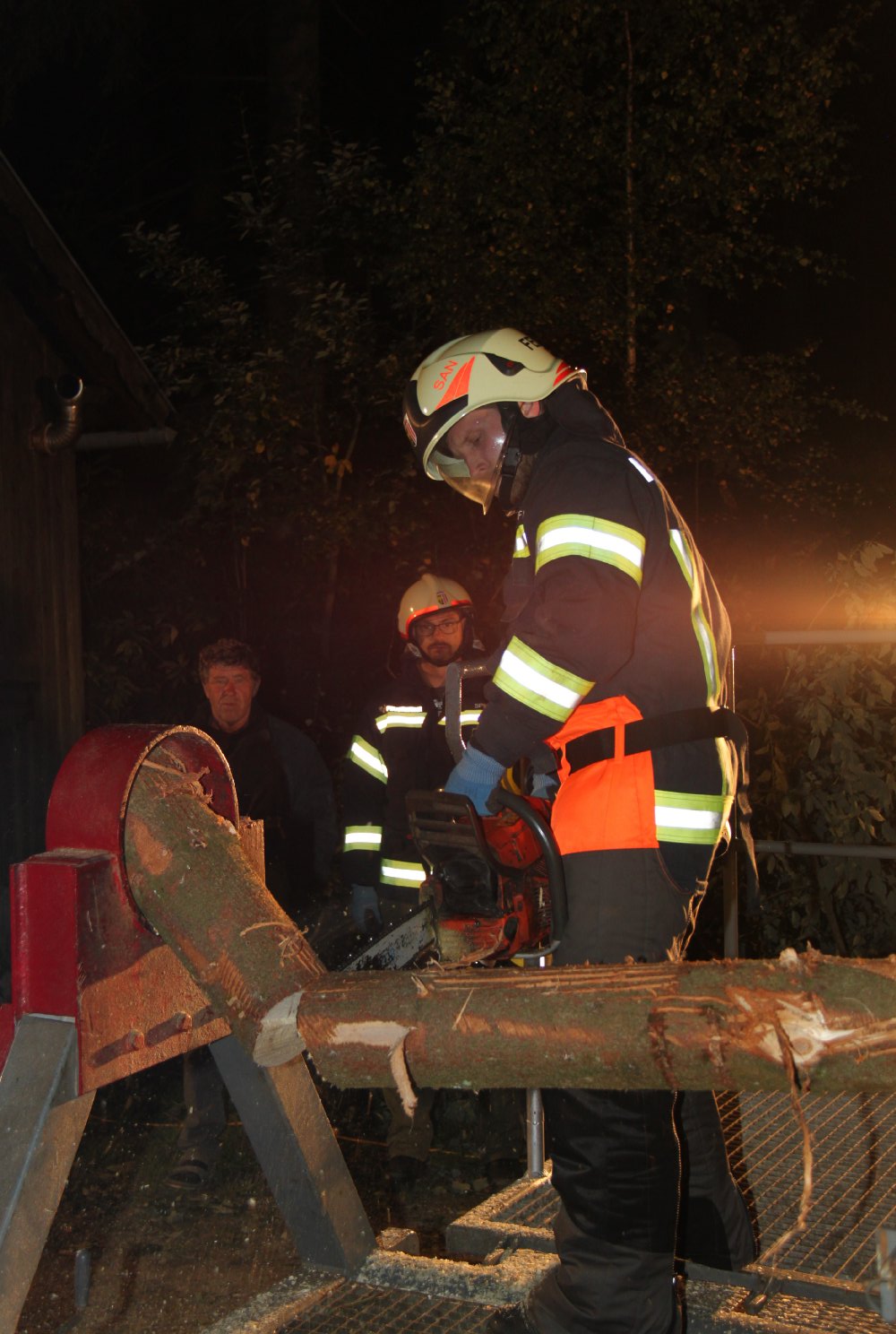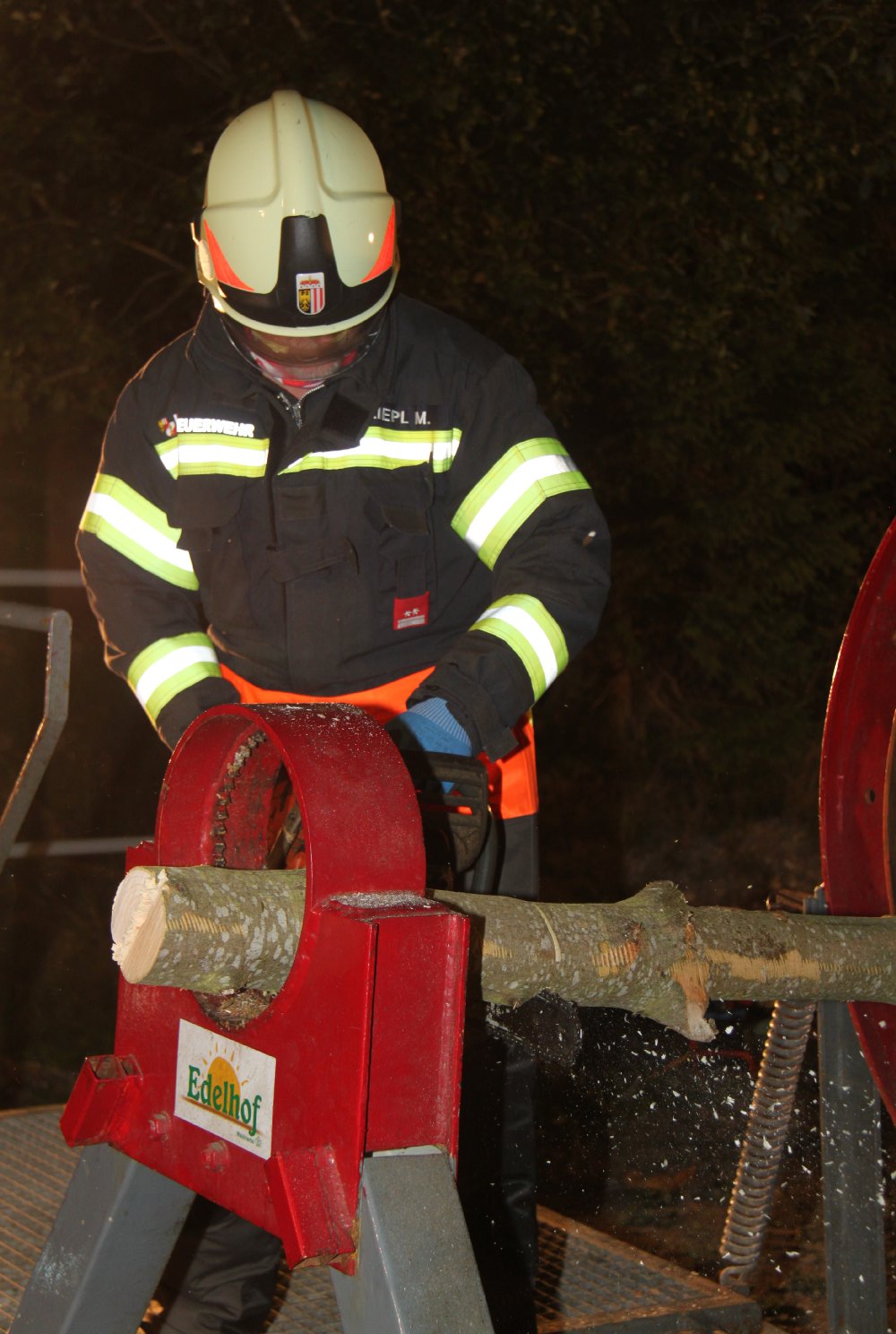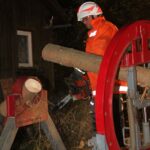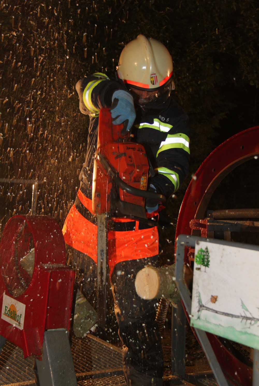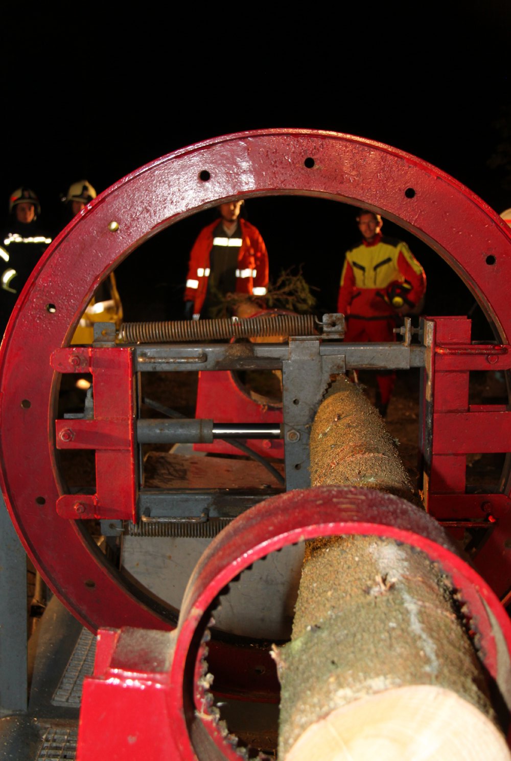 Um diese Übung relativ realitätsnah zu gestalten, haben wir uns einen Verspannungssimulator ausgeborgt. Dieser dient dazu, wie der Name schon sagt, eine Verspannung am Baum zu simulieren. Wir erhielten einen sehr guten Einblick, welche Gefahren durch verspannte Bäume auftreten können und wie ein verspannter Baum richtig zu durchtrennen ist.