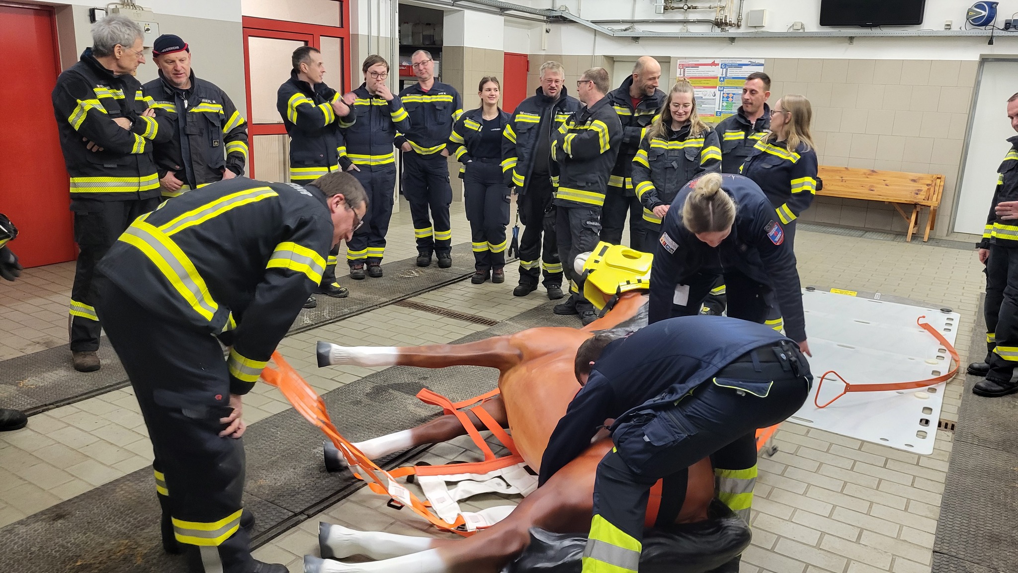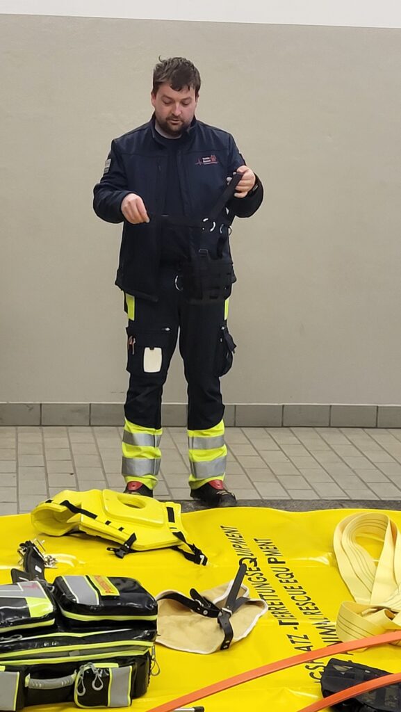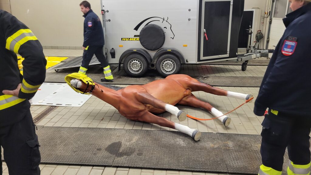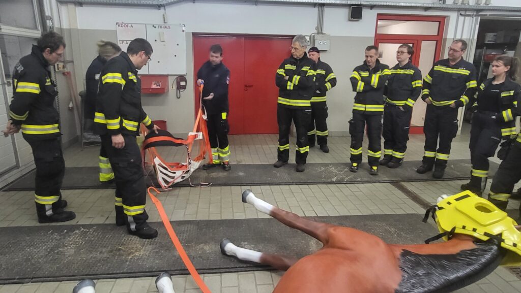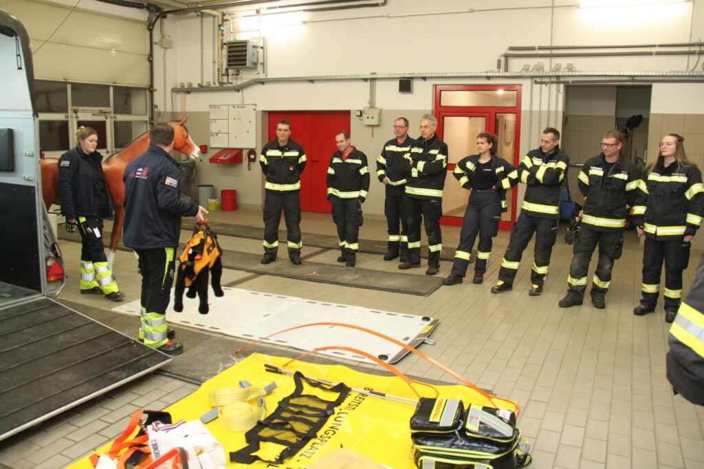 Neben der umfangreichen Theorie erhielten wir auch praktische Einweisungen. Unter anderem wurde das Anlegen eines Rettungsgeschirrs für Großtiere demonstriert und geübt. Zudem bekamen wir zahlreiche praxisnahe Tipps zum Handling von Tieren, die uns bei zukünftigen Einsätzen wertvolle Unterstützung bieten werden.